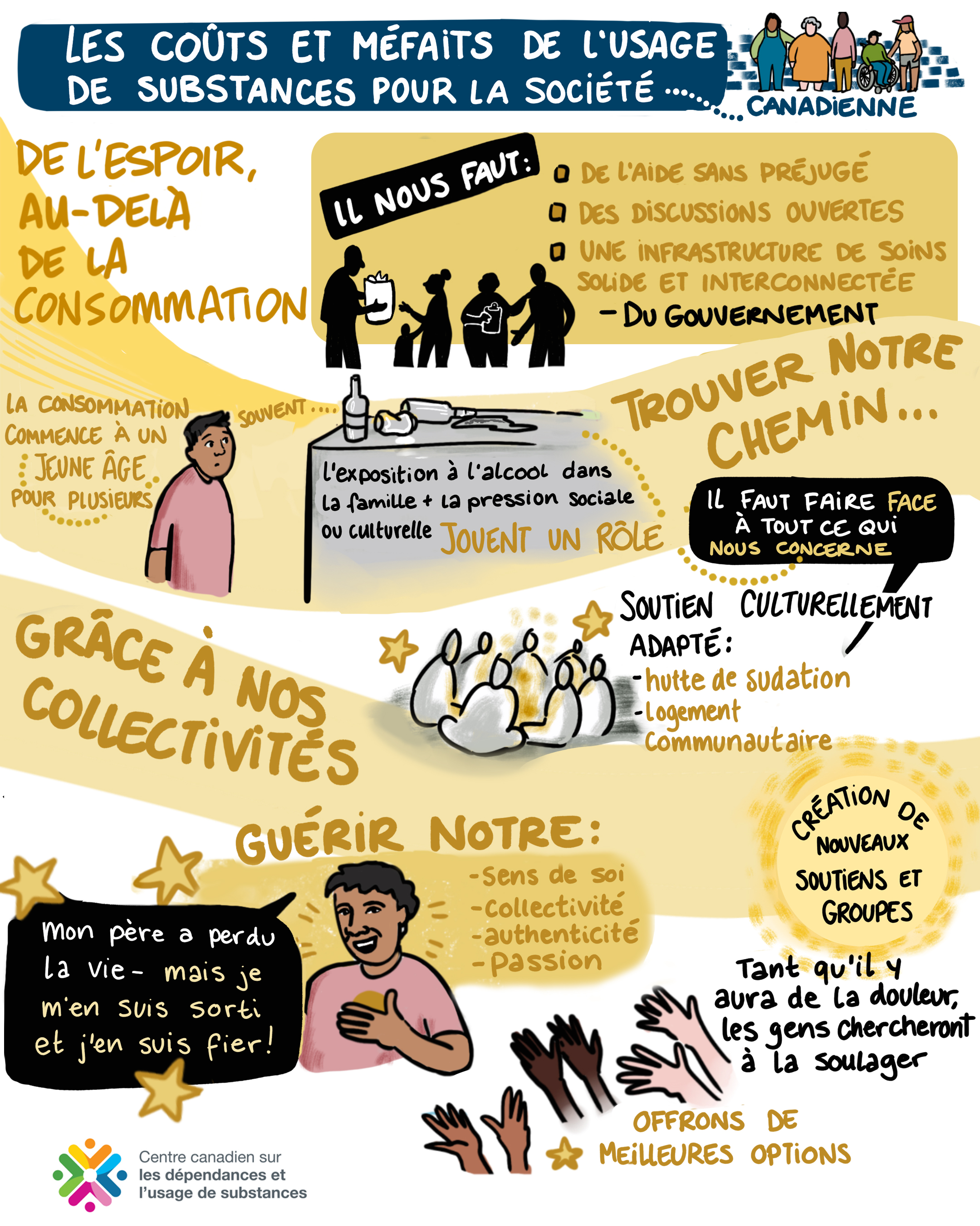 Le Centre canadien sur les dépendances et l’usage de substances a collaboré avec des personnes ayant un savoir expérientiel et leurs familles afin de comprendre leurs vécus, selon trois catégories : la justice pénale, les soins de santé et la perte de productivité. Avec leur aide, nous avons préparé une illustration de leurs cheminements et de leurs espoirs pour l’avenir.