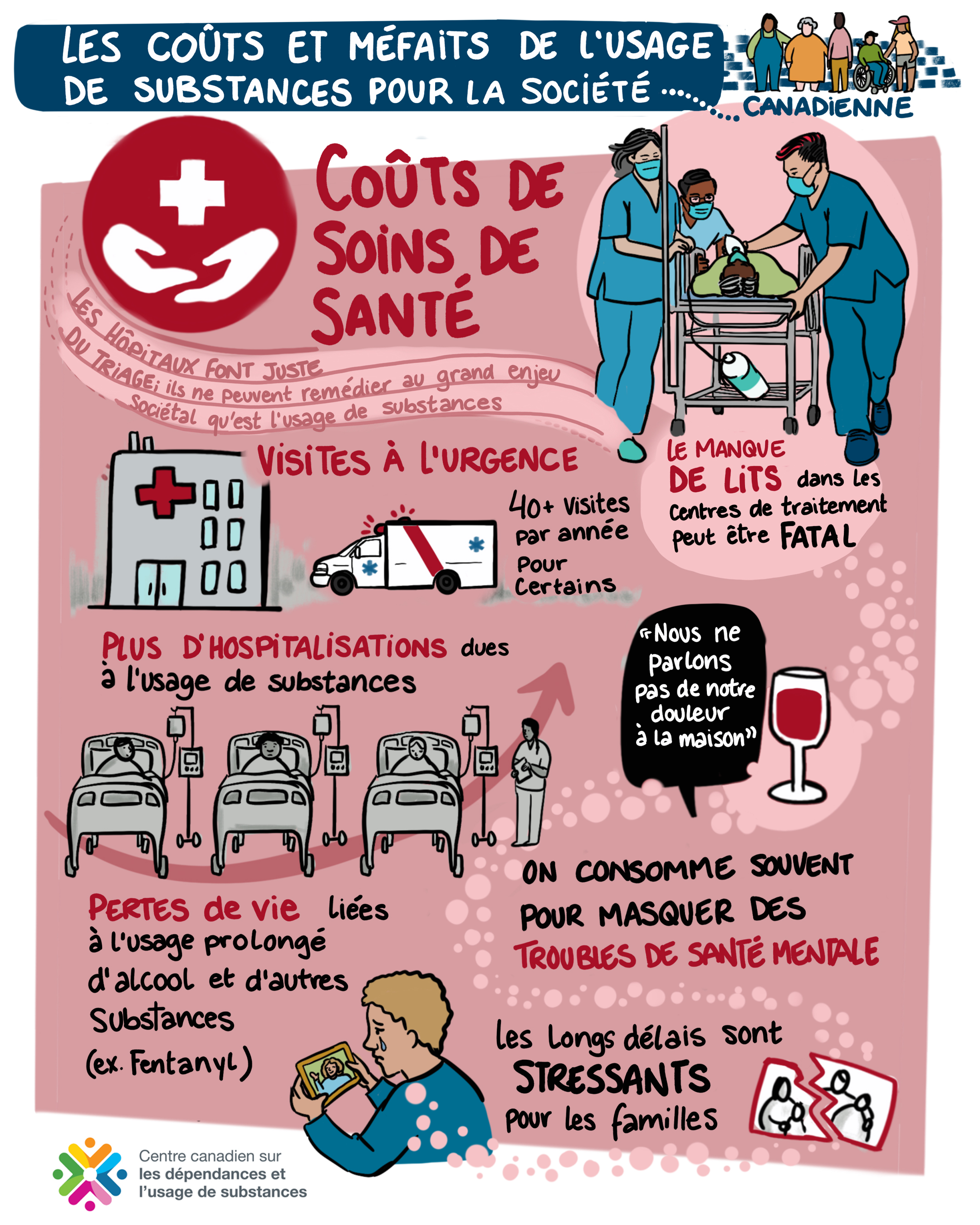 Coûts de soins de santé : Mentionne les visites à l’urgence, le manque de lits dans les centres de traitement et le nombre accru d’hospitalisations dues à l’usage de substances. Les images représentent une ambulance, des lits d’hôpital et une personne vivant du stress. Quelques messages clés : on consomme souvent pour masquer des troubles de santé mentale, et l’usage prolongé d’alcool ou d’autres substances peut être mortel.