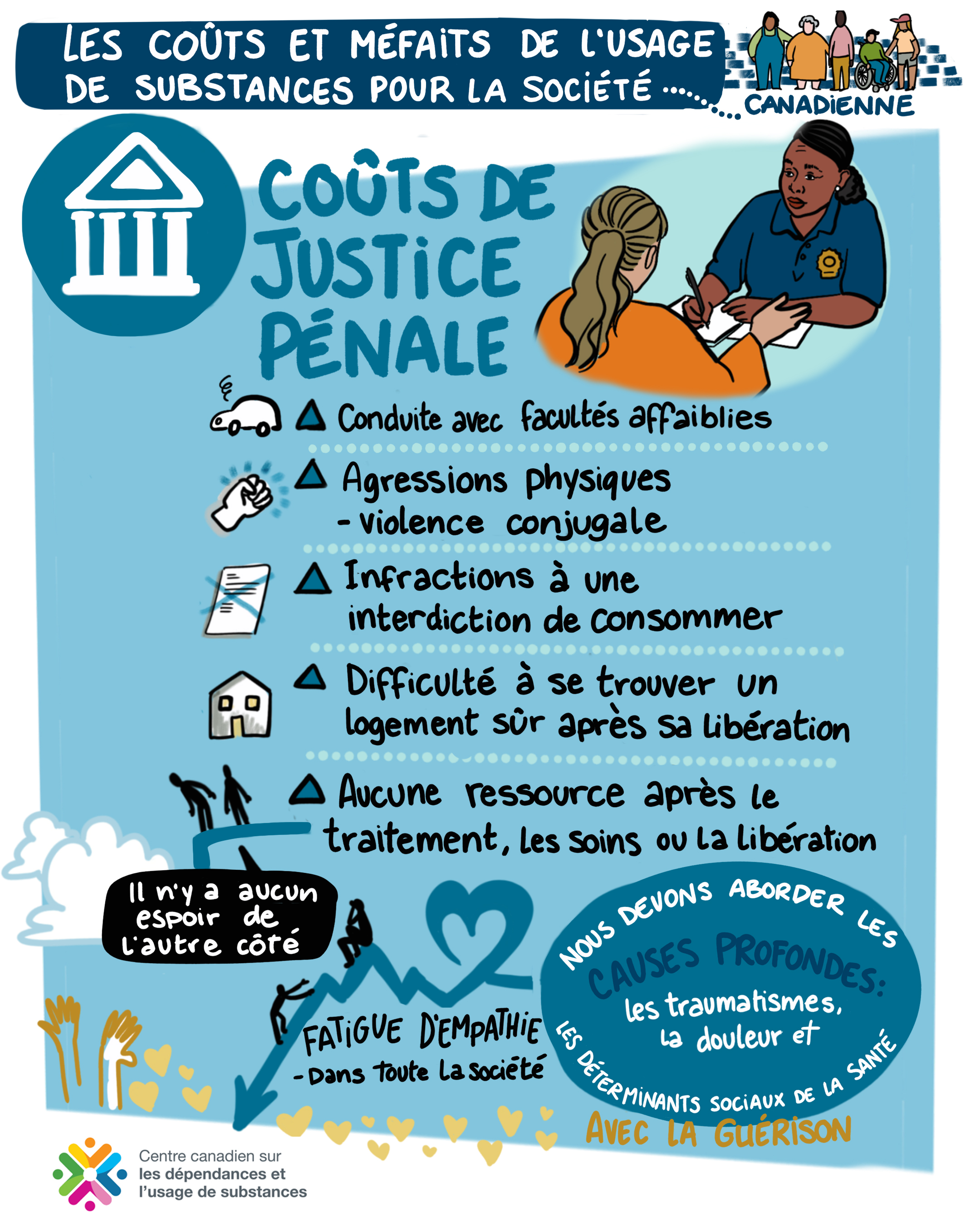 Infographie sur les coûts et méfaits de l’usage de substances pour la société canadienne : coûts de justice pénale. En dessous, énumération de tels coûts : conduite avec facultés affaiblies; agressions physiques et violence conjugale; infractions à une interdiction de consommer; difficultés à se trouver un logement sûr après sa libération; aucune ressource après le traitement, les soins ou la libération – il n’y a aucun espoir de l’autre côté. En dessous, le texte dit : fatigue d’empathie dans toute la société. Il faut tenir compte des causes profondes, comme les traumatismes, la douleur et les déterminants sociaux de la santé, pour pouvoir guérir. En appui au texte, il y a aussi sur l’infographie des icônes d’un tribunal, d’une employée pénitentiaire avec une détenue, d’une voiture, d’un poing, d’un document, d’une maison, de gens en détresse, de mains levées et de cœurs. Logo du Centre canadien sur les dépendances et l’usage de substances au bas.