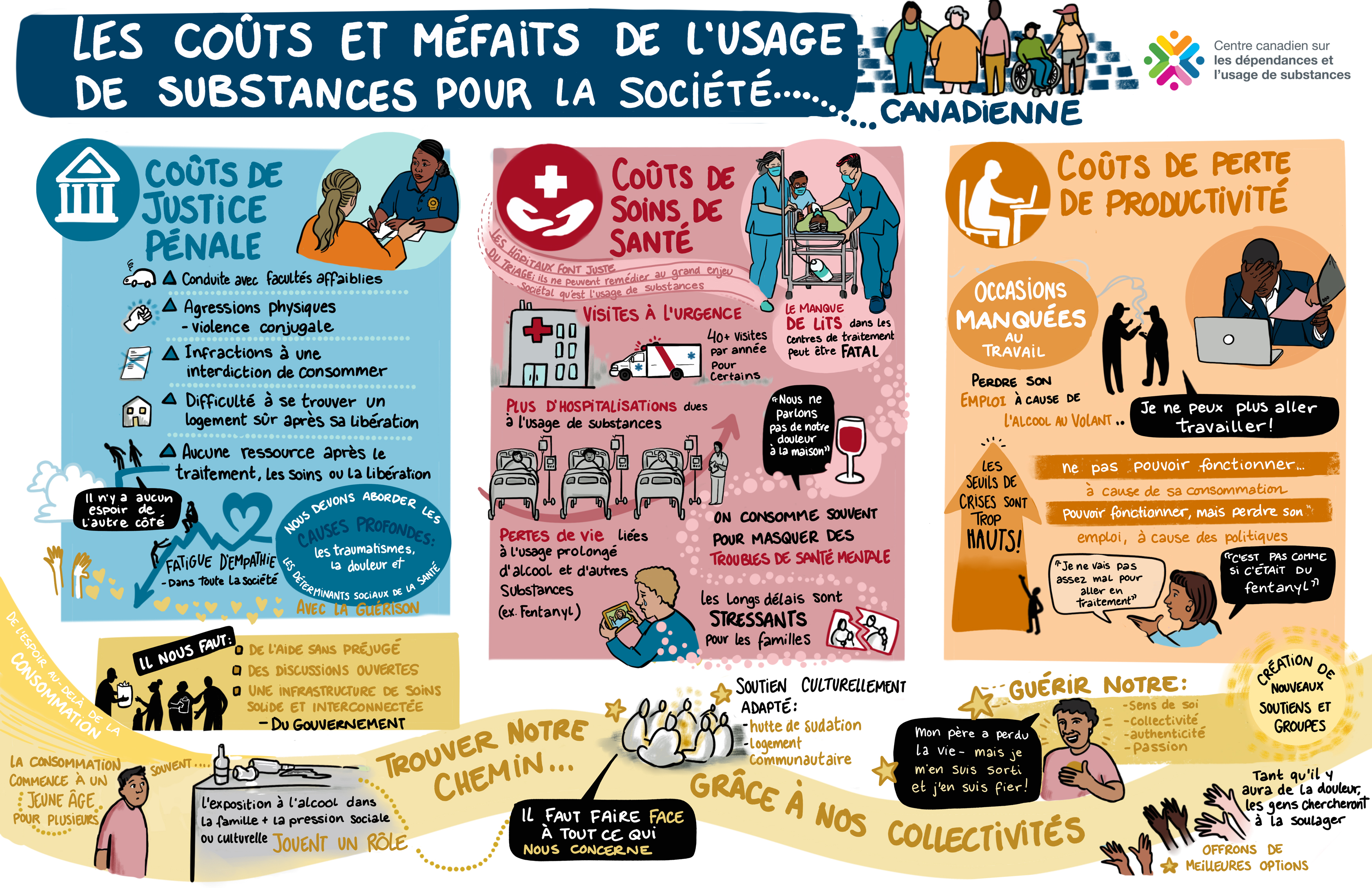 Infographie du Centre canadien sur les dépendances et l’usage de substances intitulée « Les coûts et méfaits de l’usage de substances pour la société canadienne ». Divisée en trois sections principales, de gauche à droite :