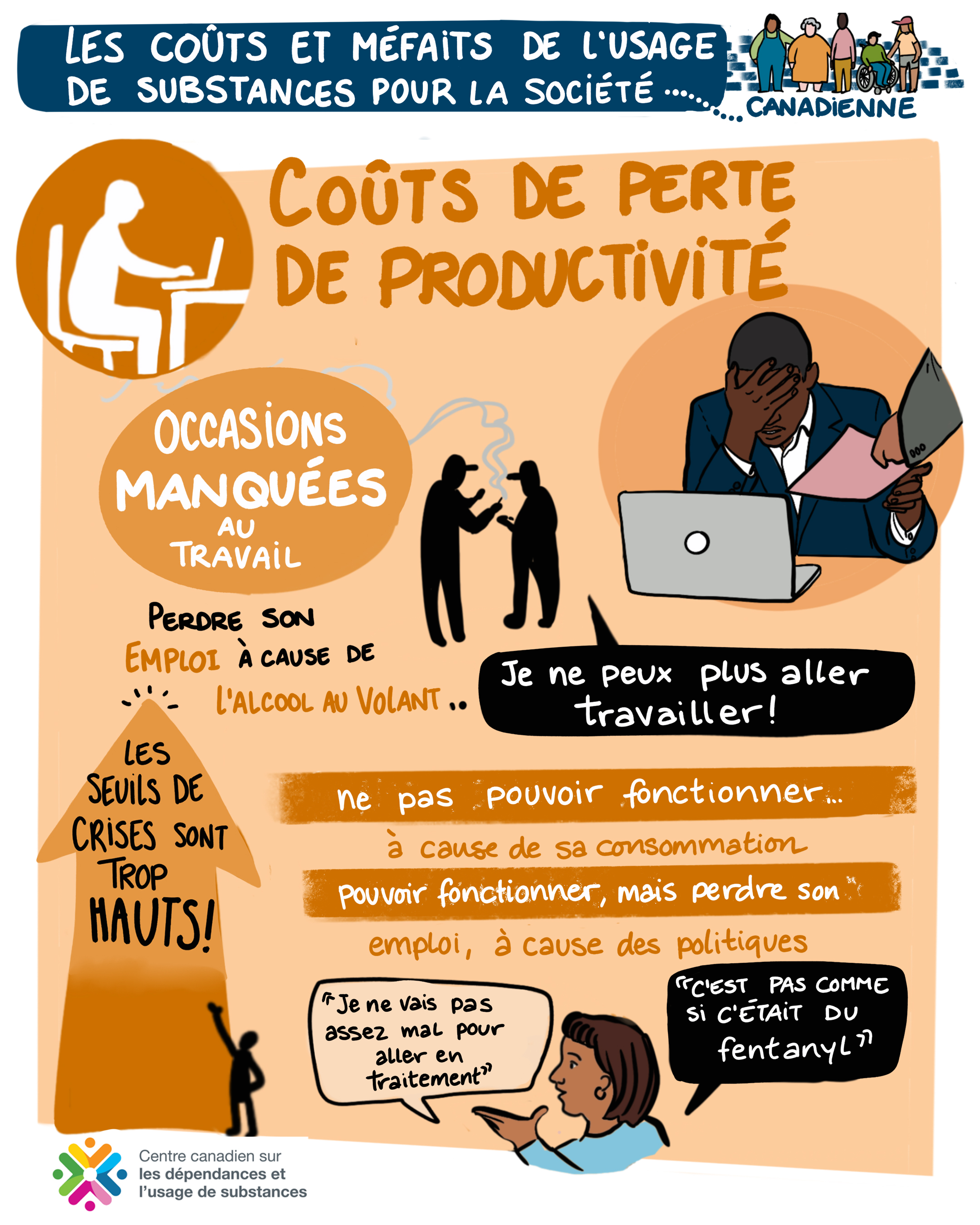Infographie sur les coûts et méfaits de l’usage de substances pour la société canadienne : coûts de perte de productivité. En dessous, énumération de tels coûts : occasions manquées au travail; perdre son emploi à cause de l’alcool au volant… « Je ne peux plus aller travailler! »; ne pas pouvoir fonctionner à cause de sa consommation, pouvoir fonctionner, mais perdre son emploi, à cause des politiques; les seuils de crises sont trop hauts; « Je ne vais pas assez mal pour aller en traitement »; « C’est pas comme si c’était du fentanyl ». En appui au texte, il y a aussi sur l’infographie des icônes de personnes vivant du stress au travail. Logo du Centre canadien sur les dépendances et l’usage de substances au bas